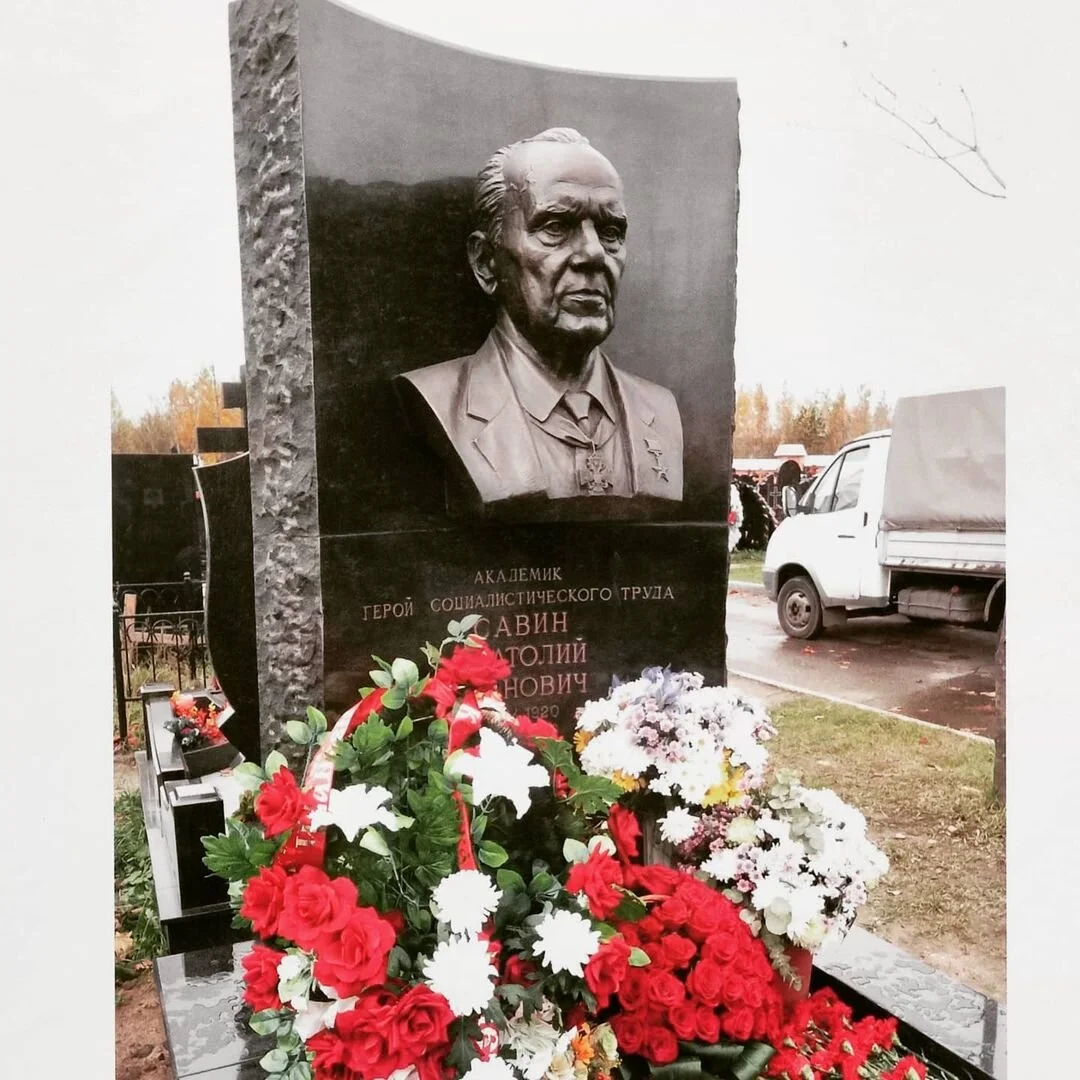Памятник академику А.И. Савину на территории концерна Алмаз-Антей в Москве, скульптурный портрет бюст голова выполнен из бронзы, на фигурной колонне-постаменте из натурального гранита и накладной бронзовый тематический рельеф